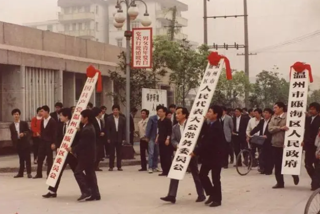 1985年 18個農民自愿入股創辦全國第一家外向型股份合作制企業——甌海登山鞋廠。