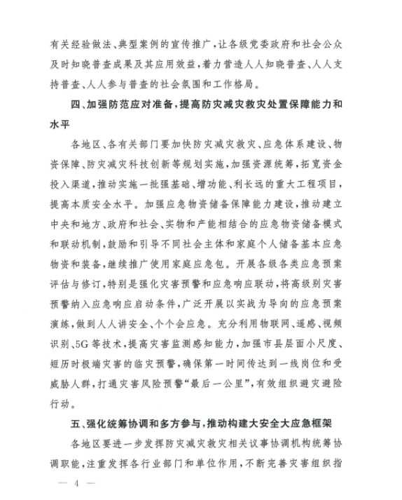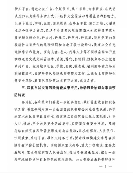 二、突出重點,深化自然災害風險普查成果應用。要進一步壓實責任,全力以赴做好普查收官階段各項工作。深化自然災害綜合風險普查成果轉化應用,圍繞重大戰略、重大工程建設、重要發展規劃、重點領域和地方實際需求,充分發揮普查成果對自然災害防治等工作的支撐作用,及時總結自然災害綜合風險普查形成的有益經驗,以全國防災減災日為契機,加強重點隱患評估、綜合風險評估與區劃等普查成果的解讀和經驗做法、典型案例的宣傳推廣,提升普查成果及其應用效益的社會知曉率。