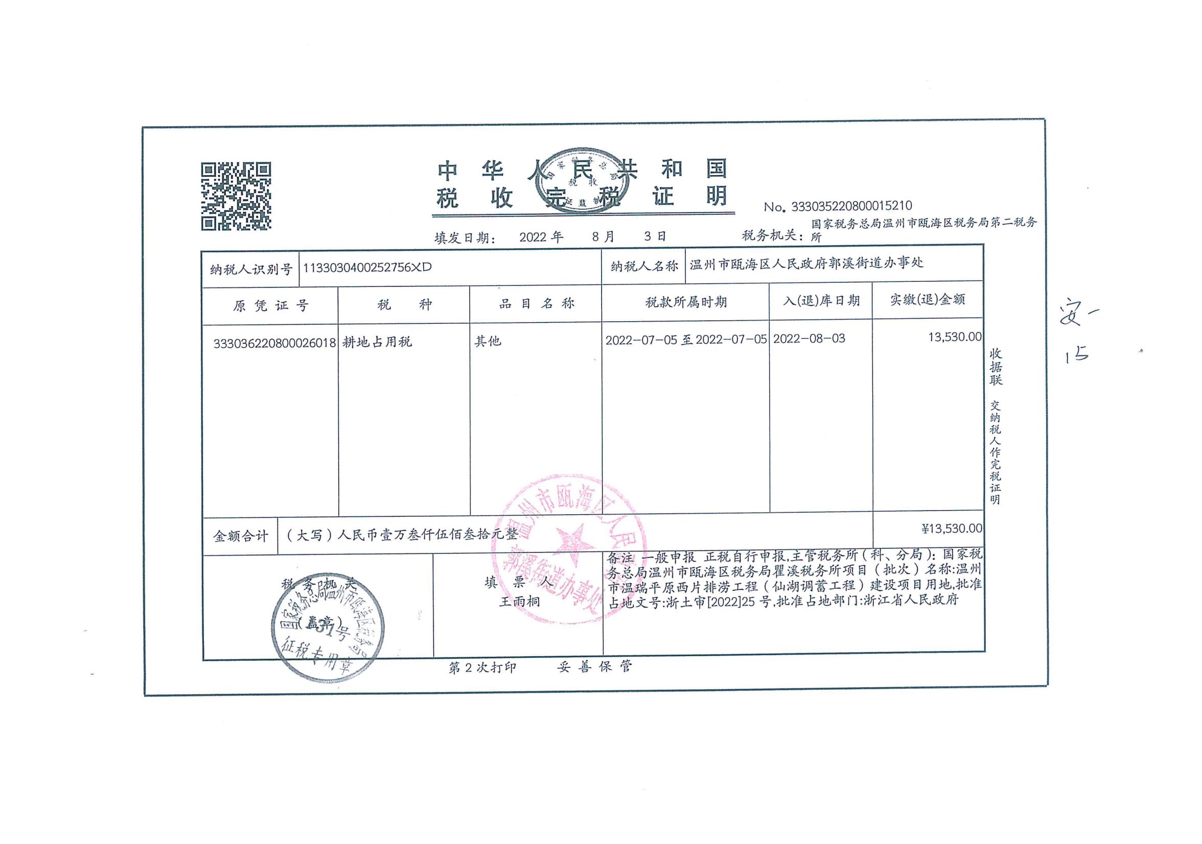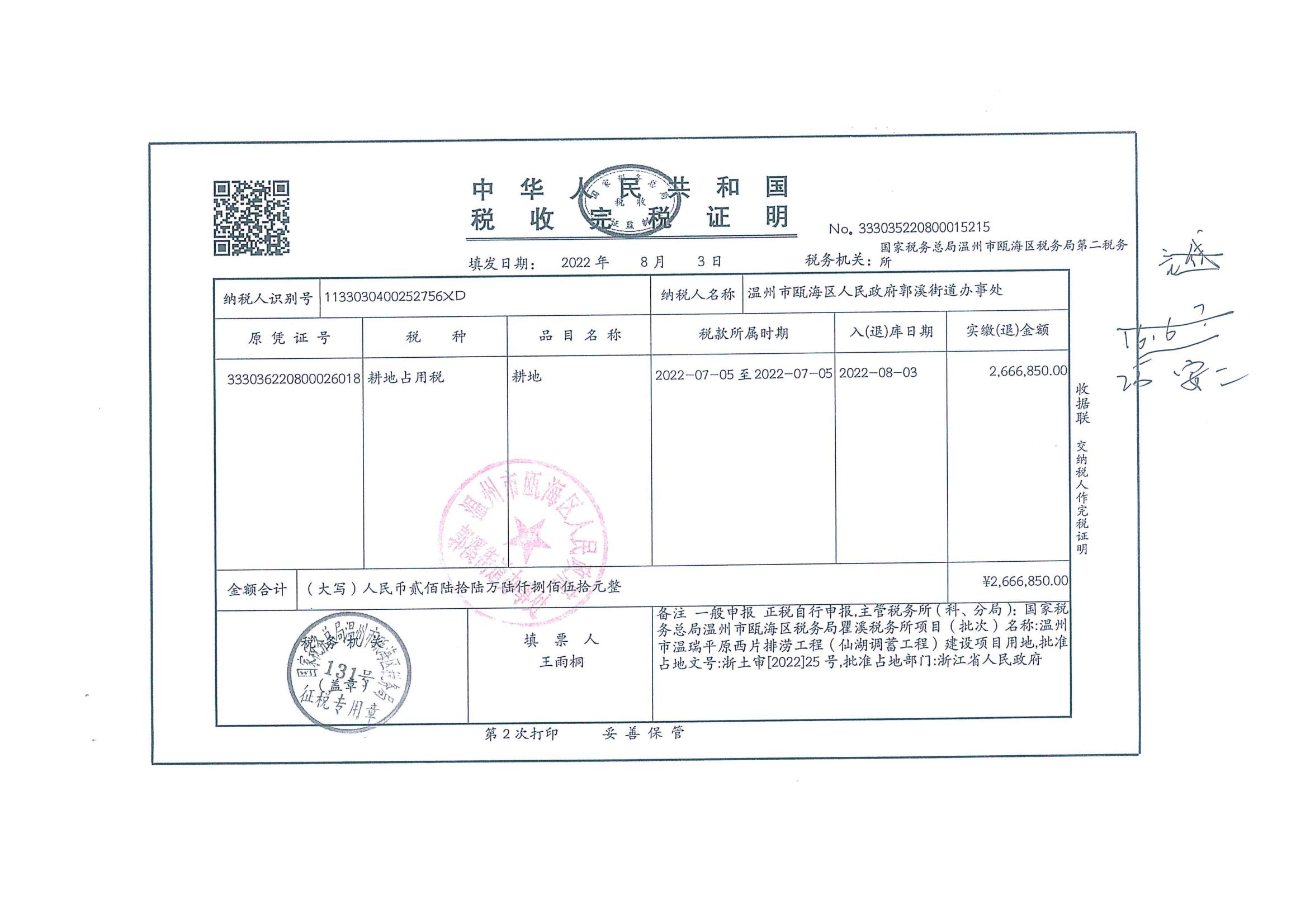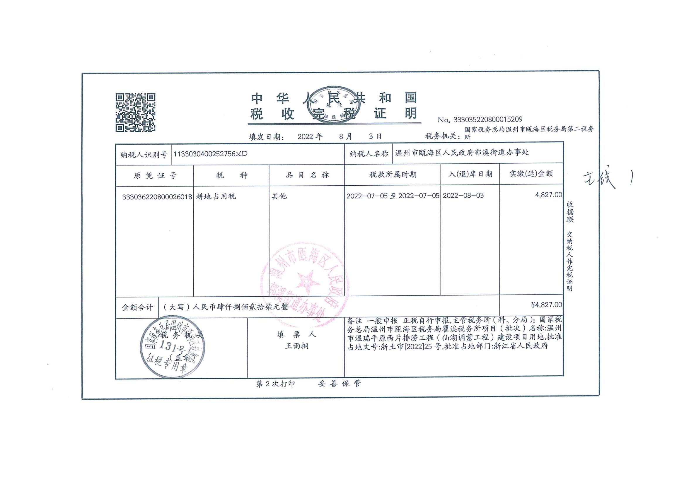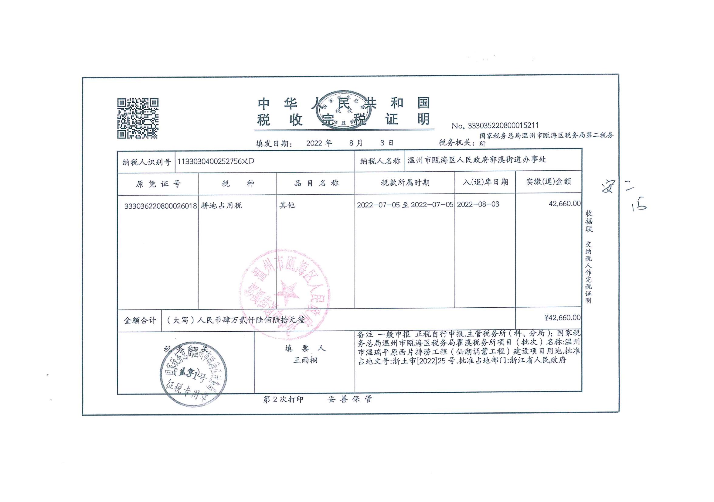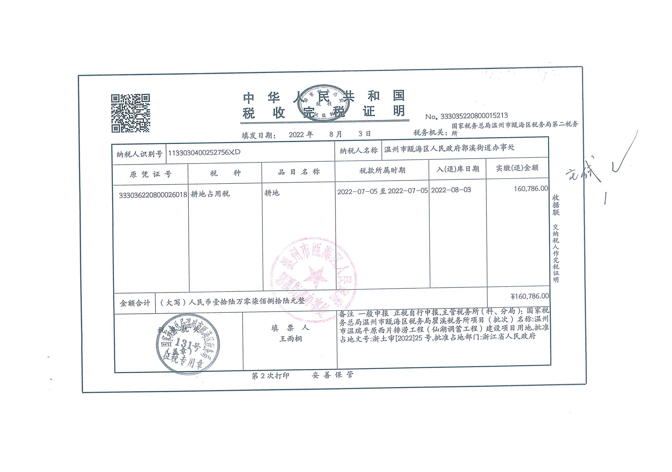 郭溪街道塘下村 溫州市溫瑞平原西片排澇工程(仙湖調蓄工程)征地費用收據