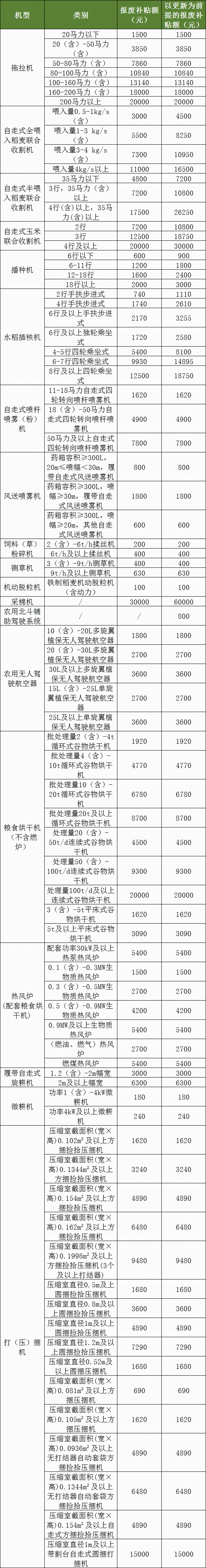 《新方案》從原有7類報廢機具增加到15類報廢機具,省域內從事農業生產的農民和農業生產經營組織,在我省各縣(市、區)辦理的農機購置補貼機具(拖拉機和聯合收割機需注冊登記)、申請人能提供其權屬證明(購機發票等有效原始憑證)的拖拉機、播種機、聯合收割機(含糧棉油糖等作物聯合收割所用機械)、水稻插秧機、農用北斗輔助駕駛系統、機動噴霧(粉)機、機動脫粒機、飼料(草)粉碎機、鍘草機、糧食烘干機、熱風爐、履帶自走式旋耕機、農用無人駕駛航空器、微耕機、打(壓)捆機等均可申請報廢補貼。