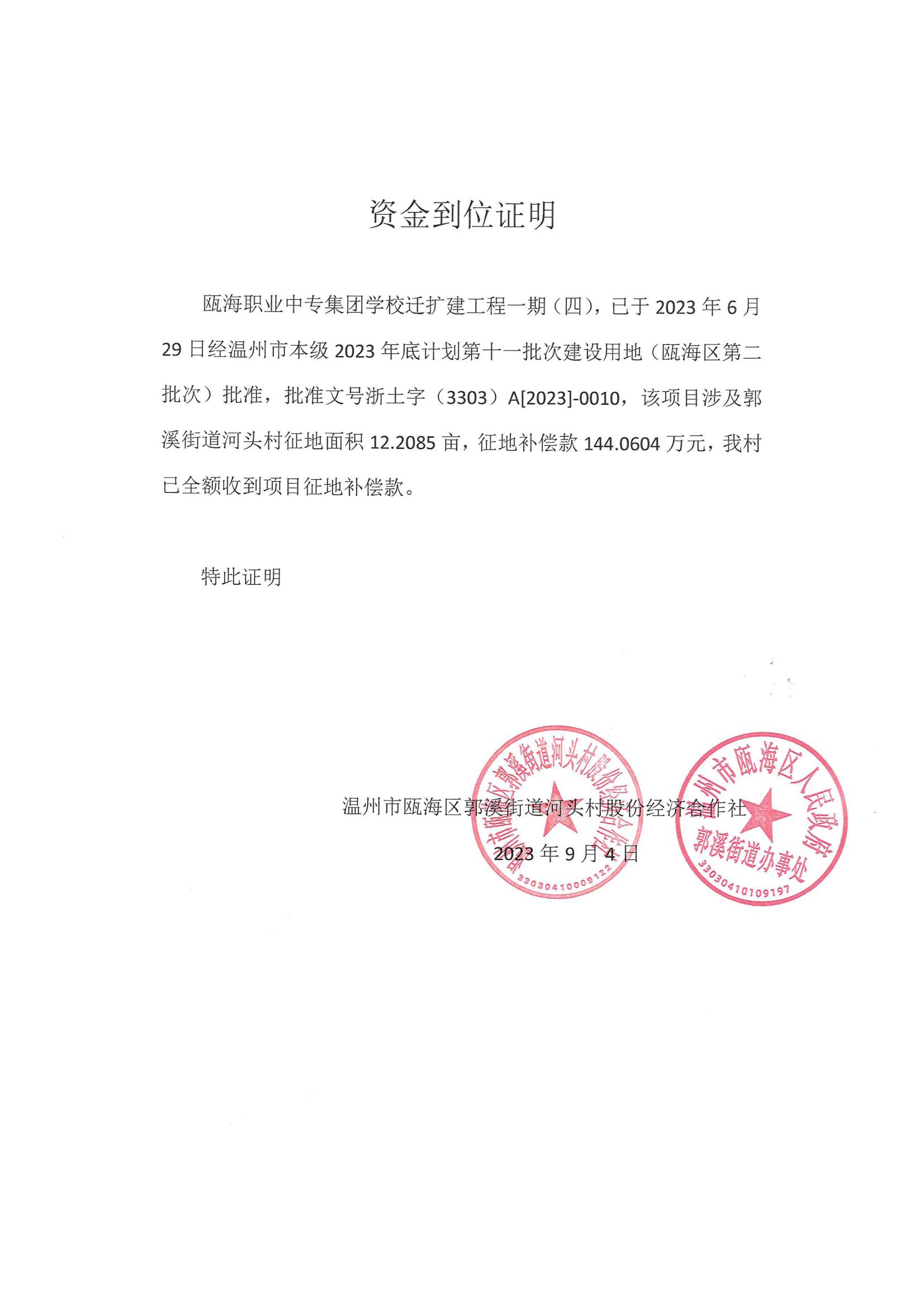 郭溪街道河頭村 甌海職業中專集團學校遷擴工程一期(四)征地費用收據
