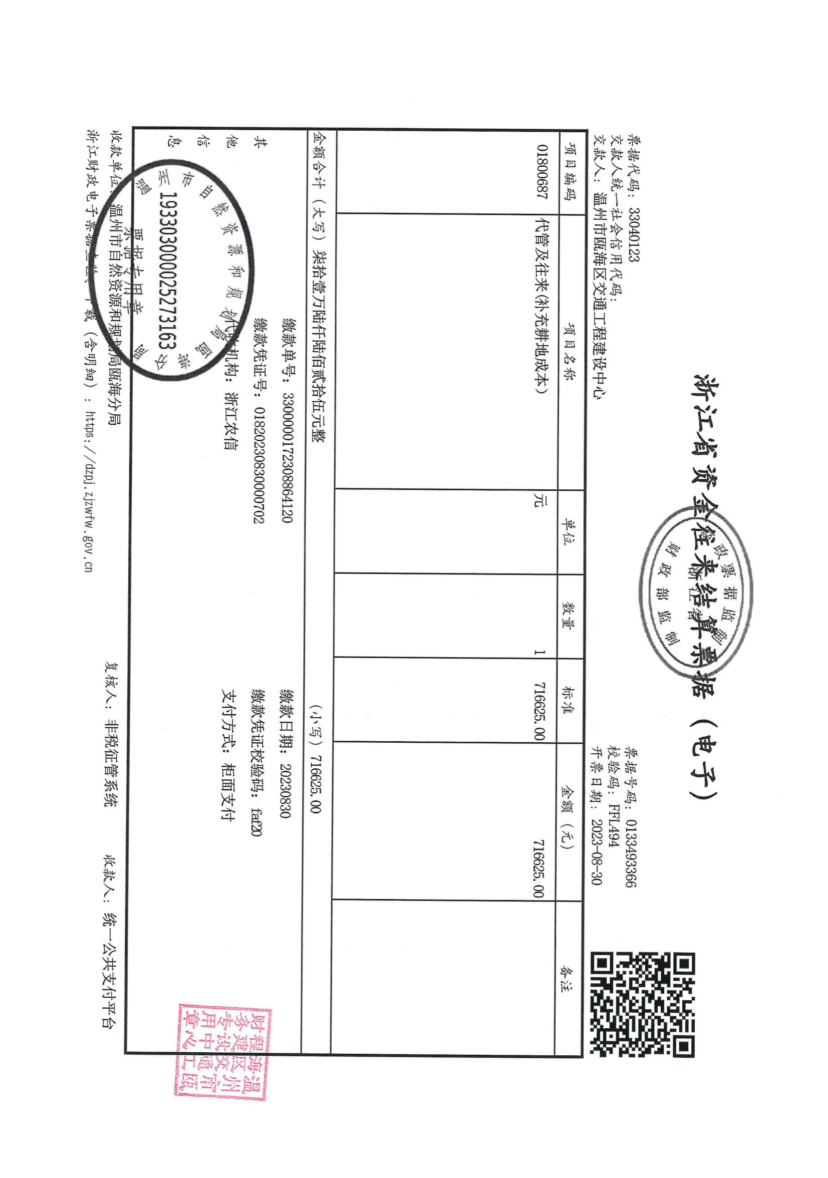 南白象街道白象村 溫州市南環線工程-龍霞路至溫州南樞紐橋梁征地費用收據