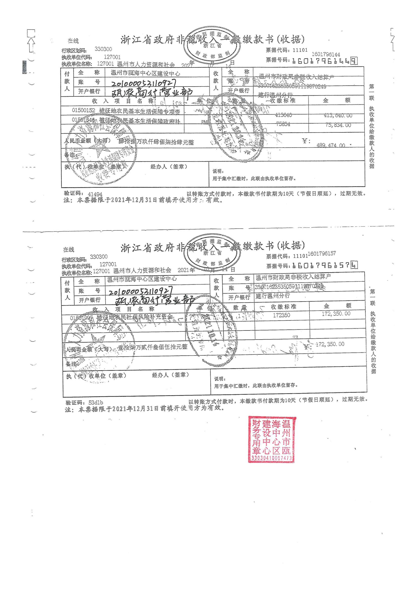 新橋街道高翔村 甌海區(qū)梧田街道南堡村城中村改造低效用地(HX-ns04-004、007地塊)征地費(fèi)用收據(jù)