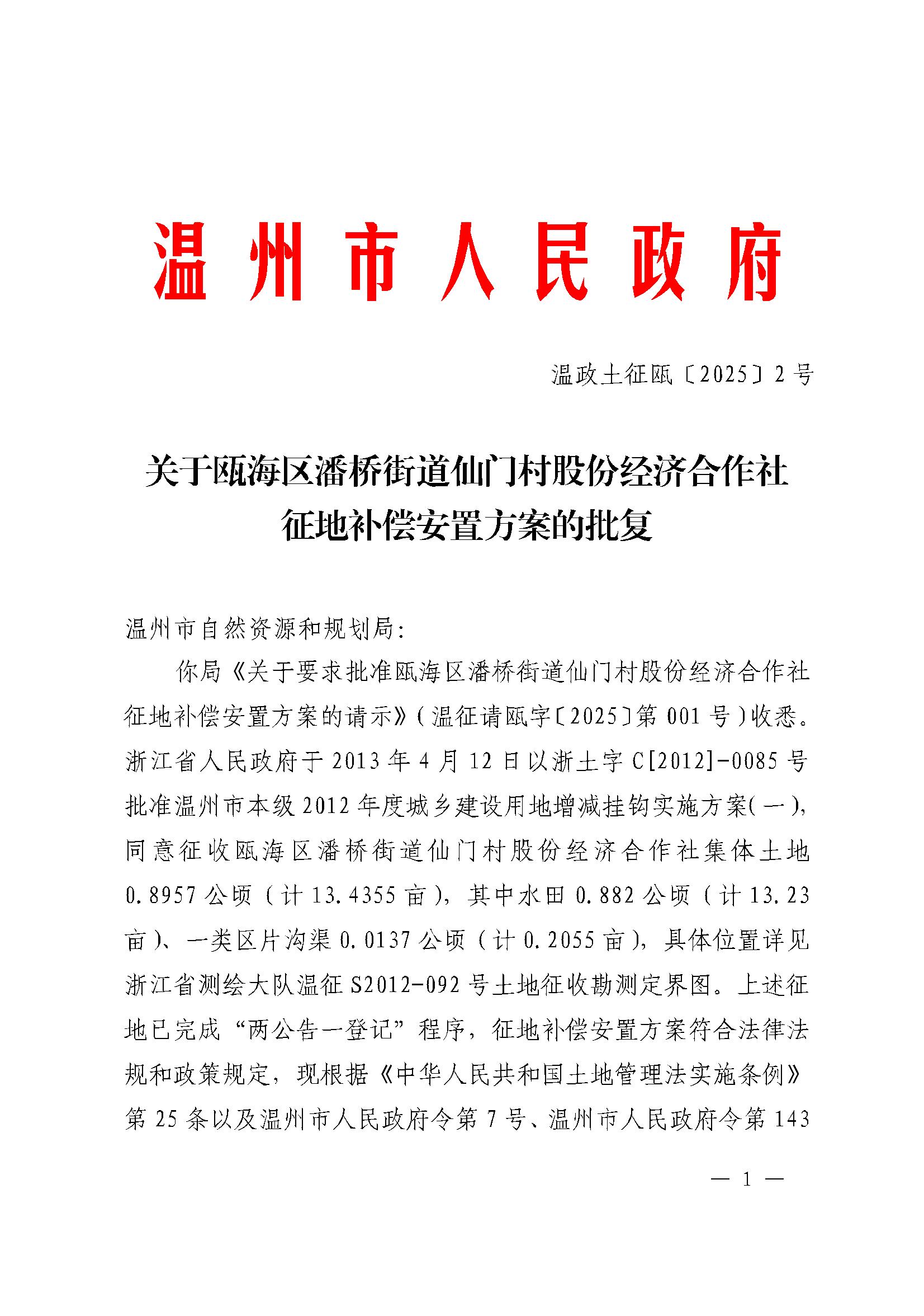 關于甌海區潘橋街道仙門村股份經濟合作社征地補償安置方案的批復.pdf