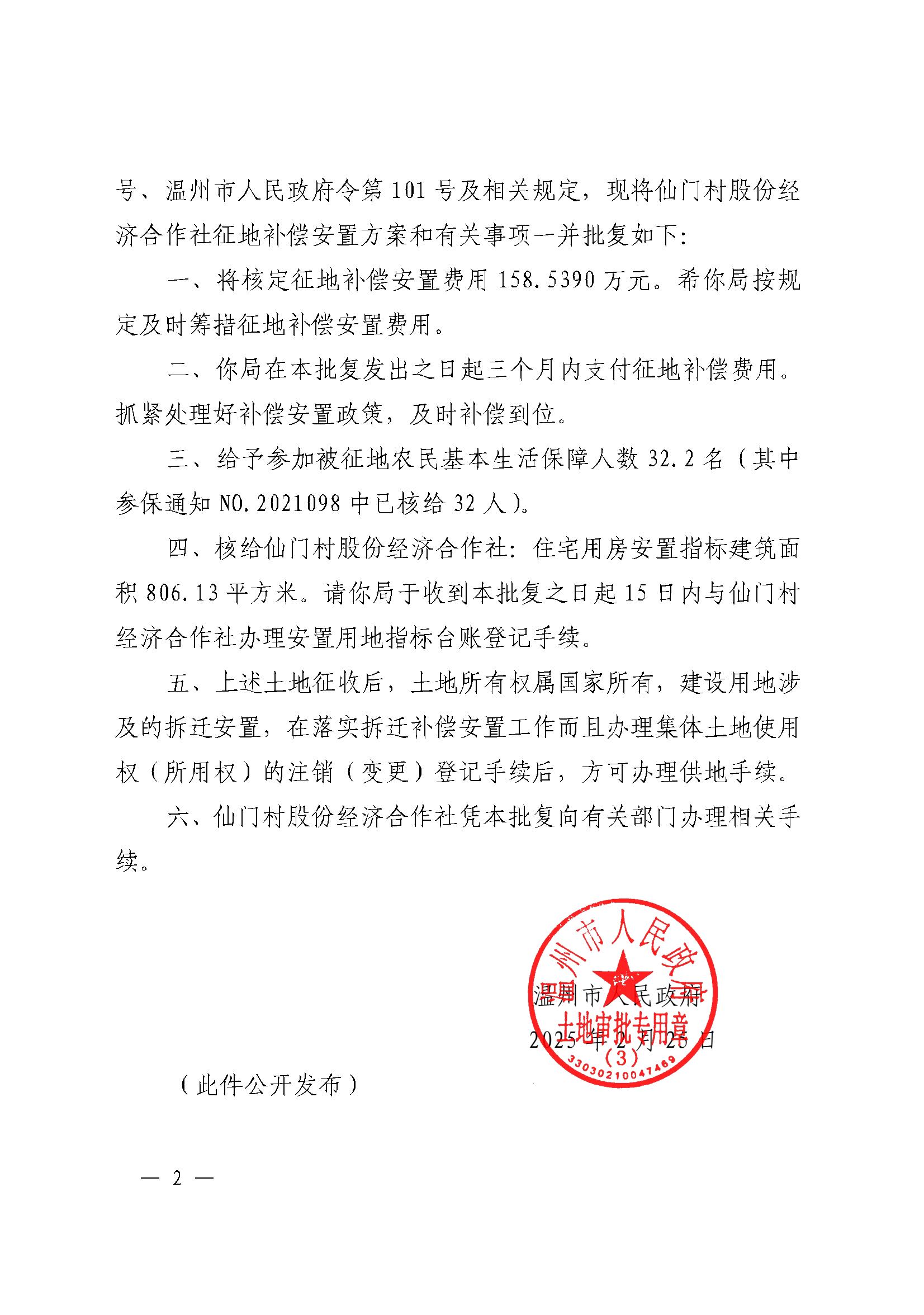 潘橋街道仙門村 104國道溫州西過境公路仙門拆遷安置地塊批復(溫政土征甌(2025)2號)