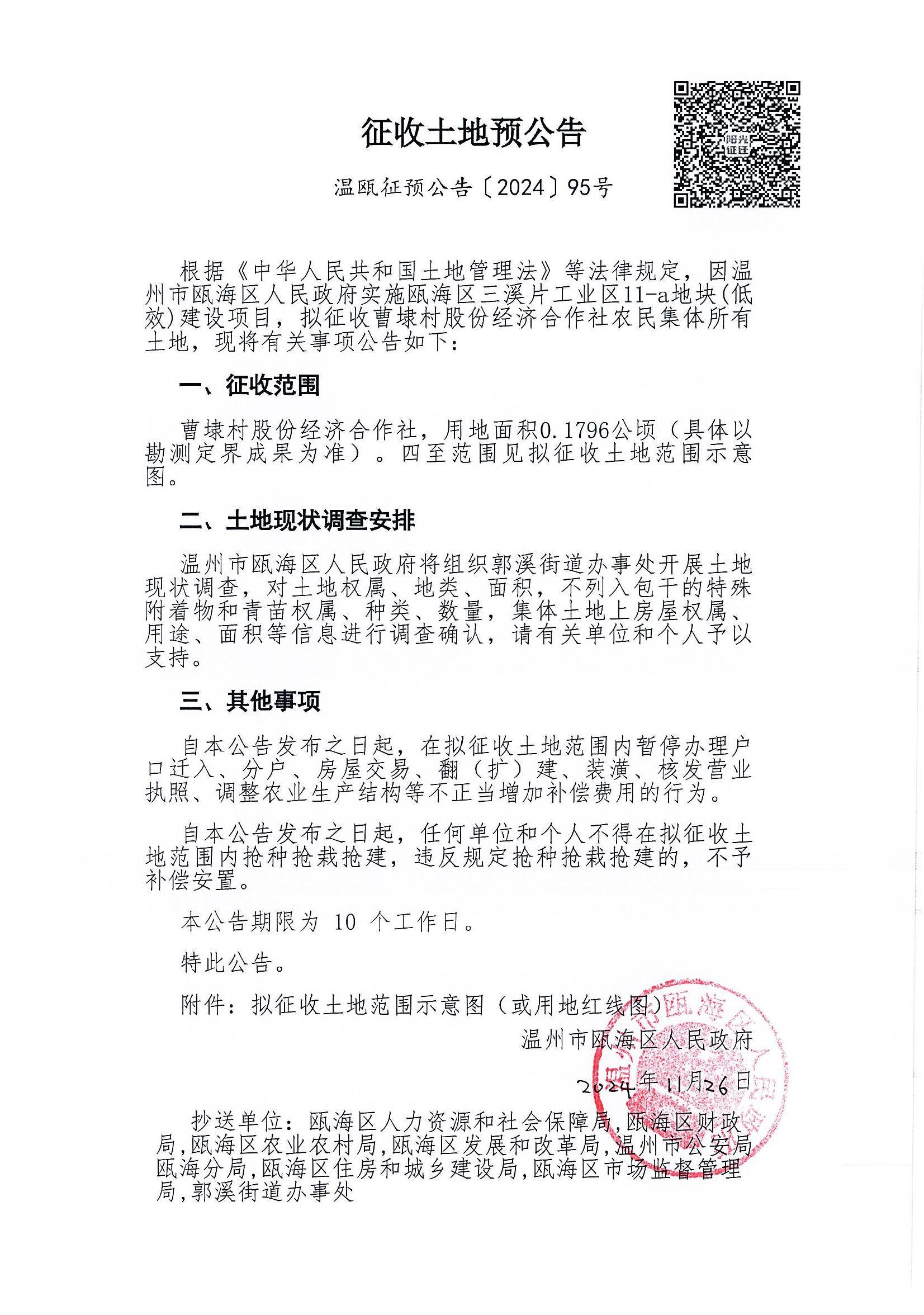 郭溪街道曹埭村 甌海區(qū)三溪片工業(yè)區(qū)11-a地塊(低效)征收土地預(yù)公告(溫甌征預(yù)公告(2024)95號)