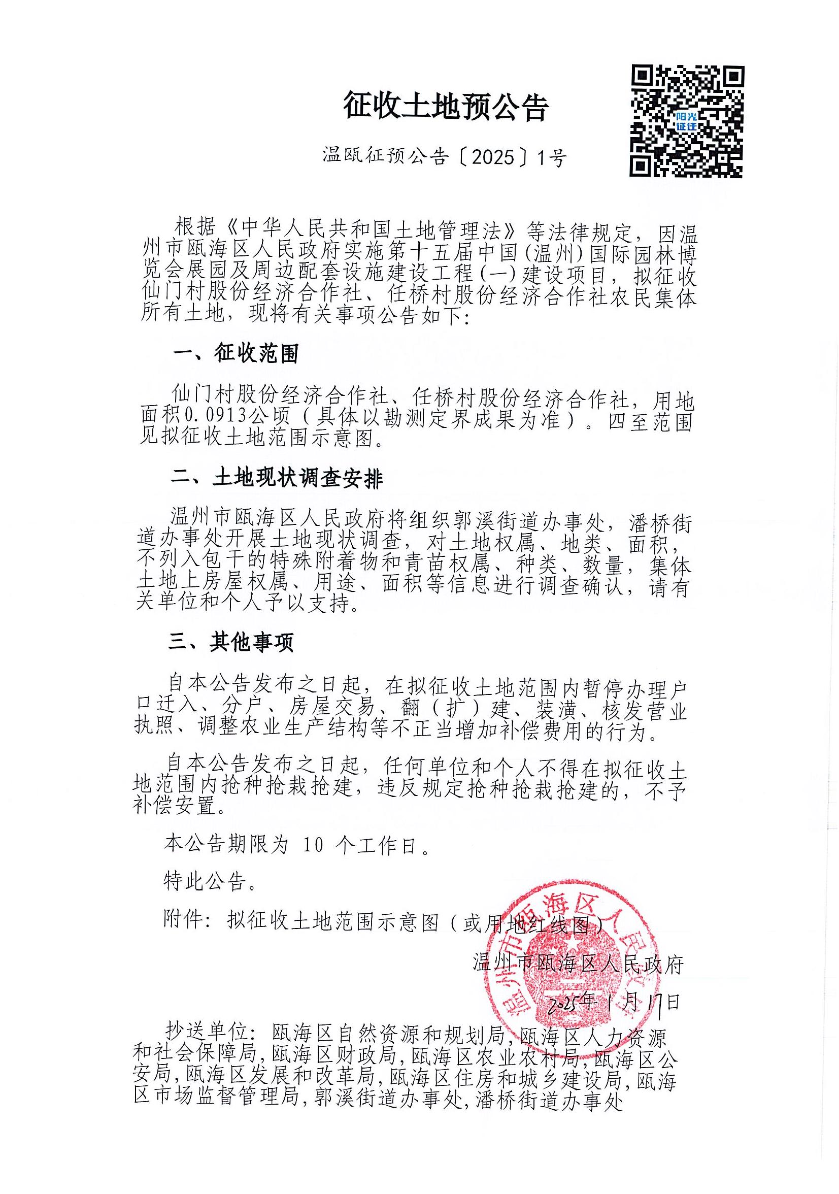 潘橋街道仙門村 第十五屆中國(溫州)國際園林博覽會(huì)展園及周邊配套設(shè)施建設(shè)工程(一)征收土地預(yù)公告(溫甌征預(yù)公告(2025)1號(hào))