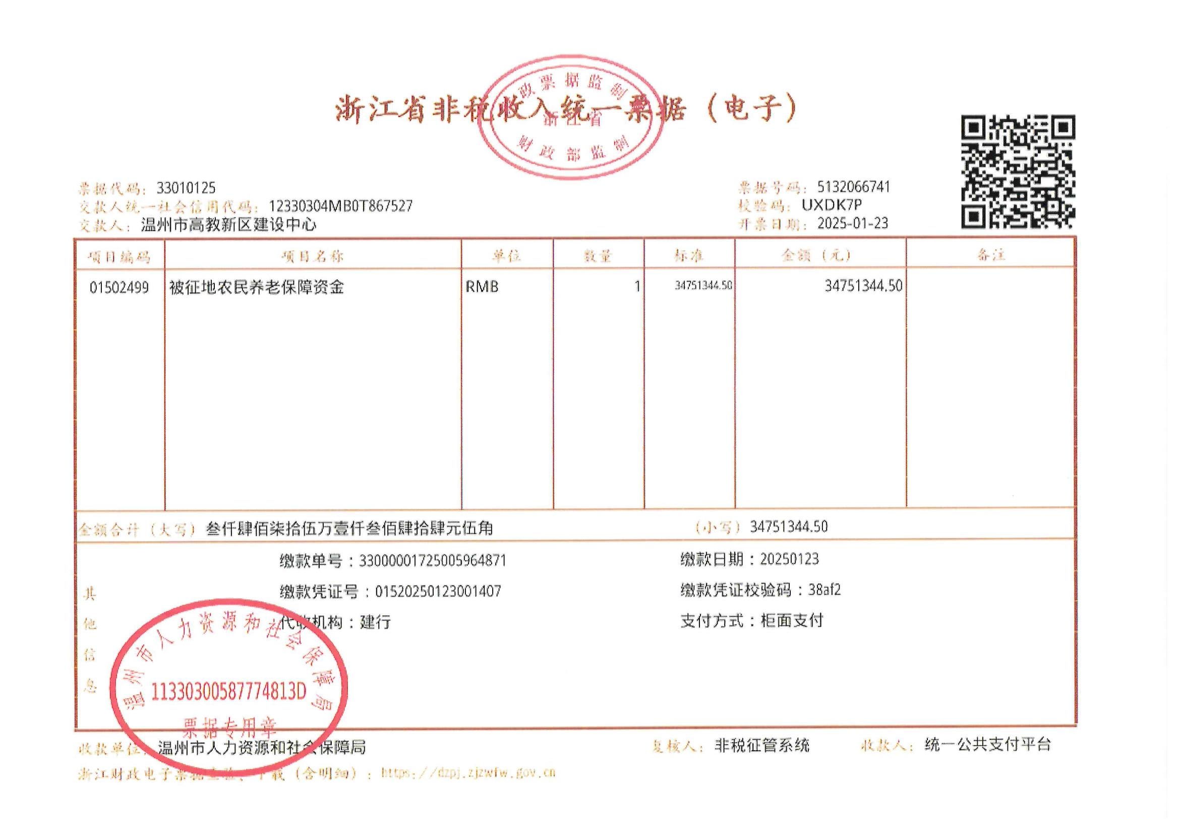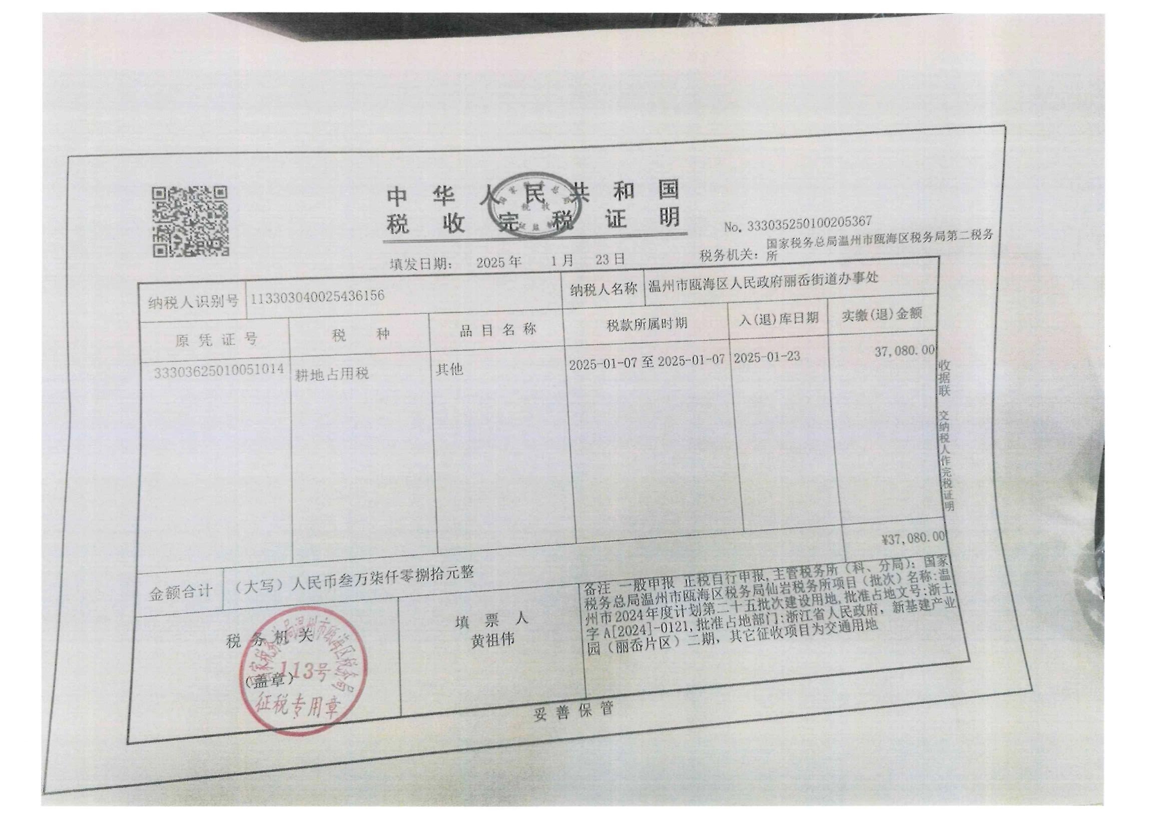 麗岙街道河頭村 新基建產(chǎn)業(yè)園(麗岙片區(qū))二期征地費用收據(jù)