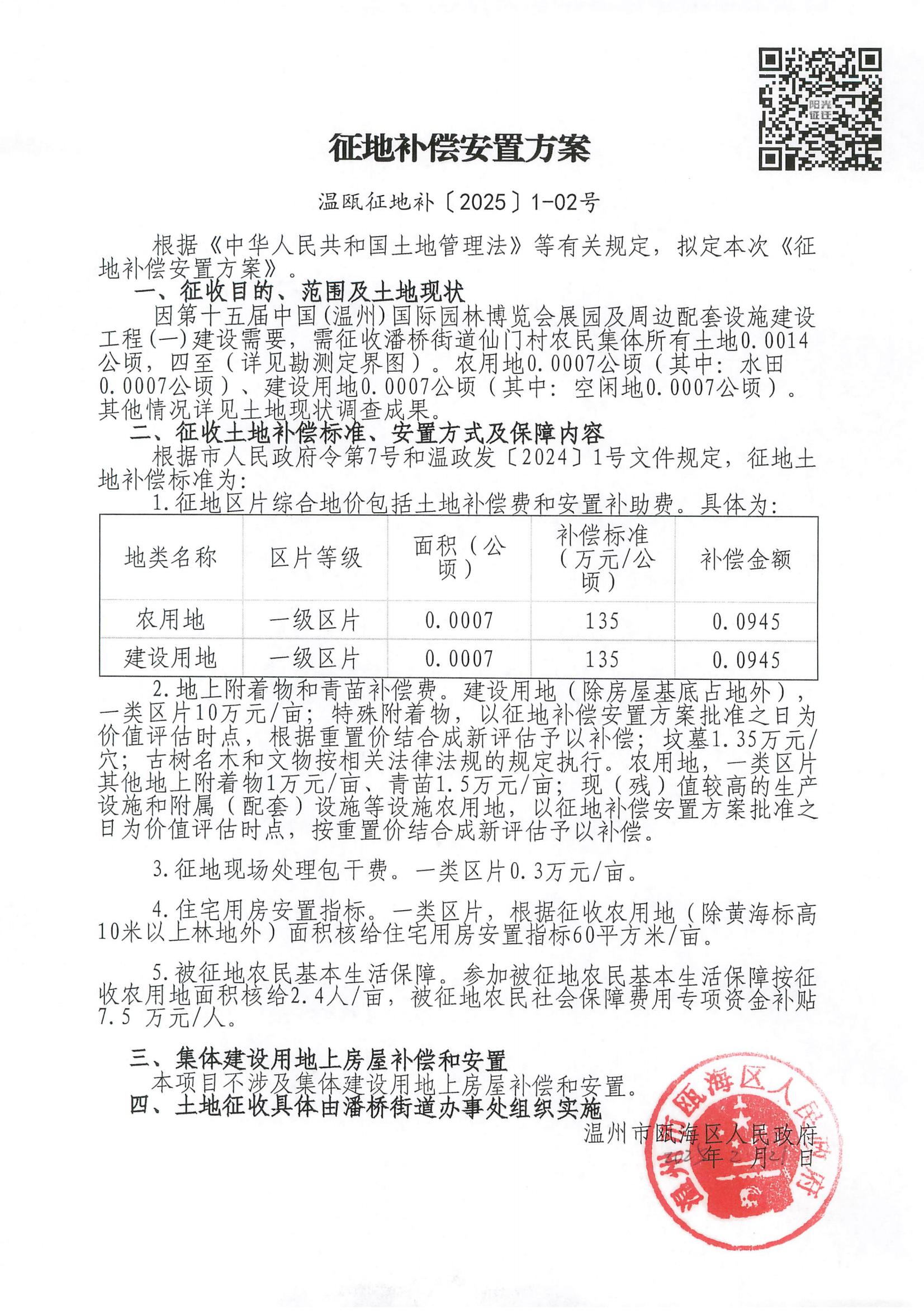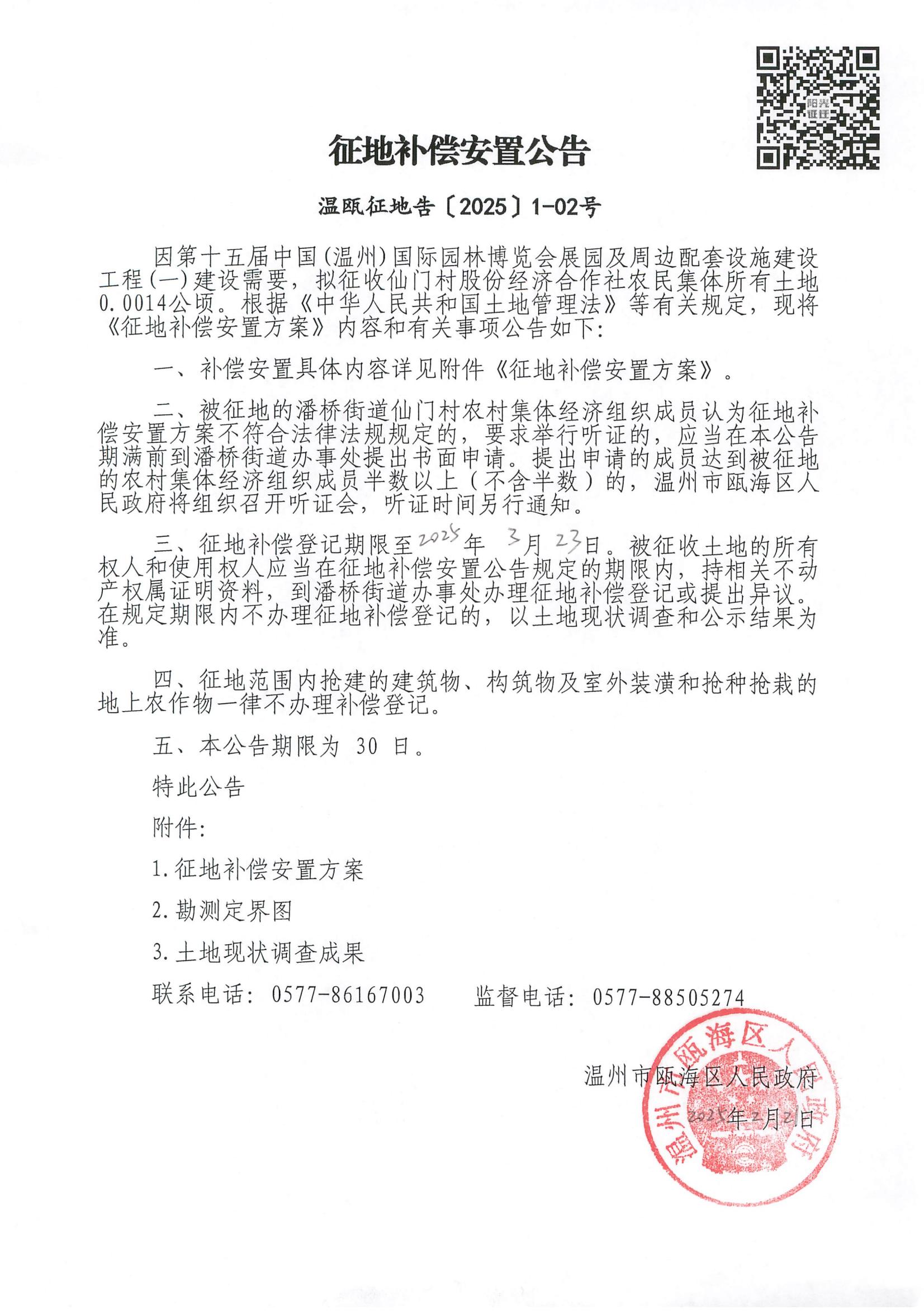 潘橋街道仙門村 第十五屆中國(溫州)國際園林博覽會展園及周邊配套設施建設工程(一)征地補償安置公告(溫甌征地告(2025)1-02號)