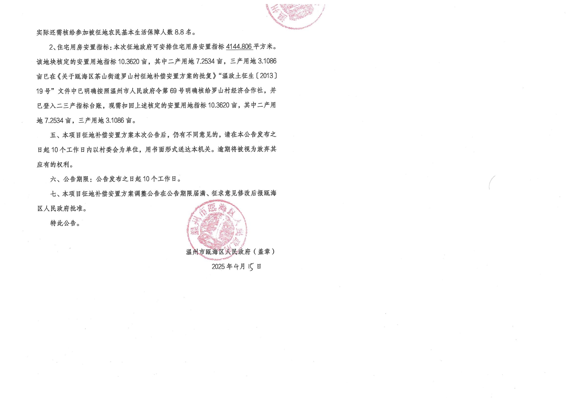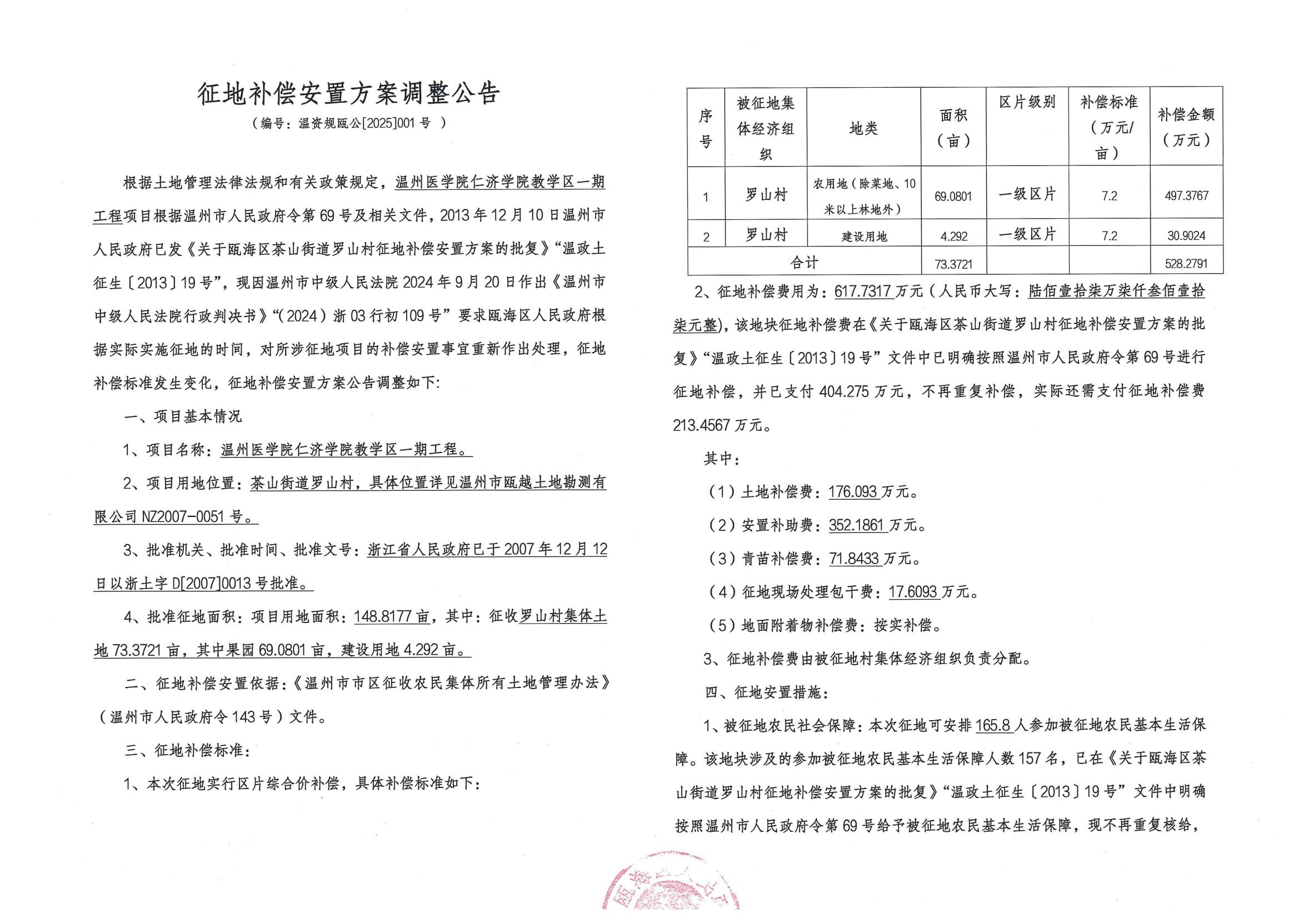 茶山街道羅山村 溫州醫學院仁濟學院教學區一期工程征地補償安置方案調整公告(溫資規甌公(2025)001號)